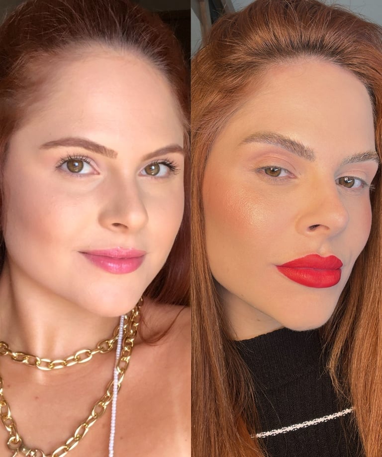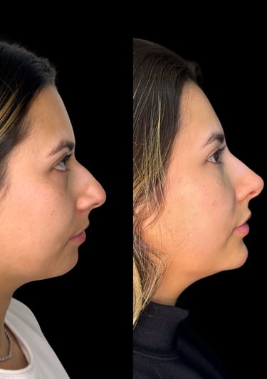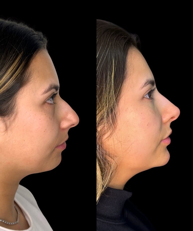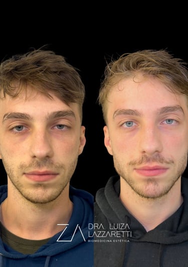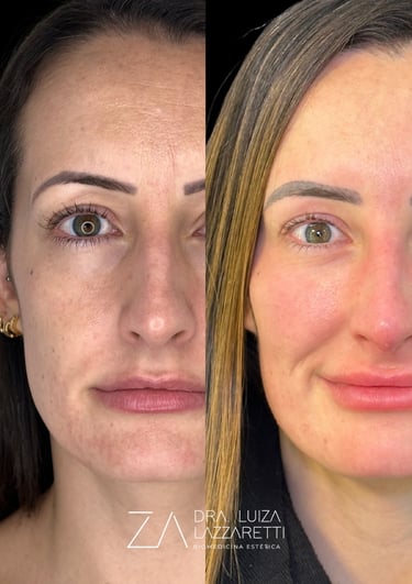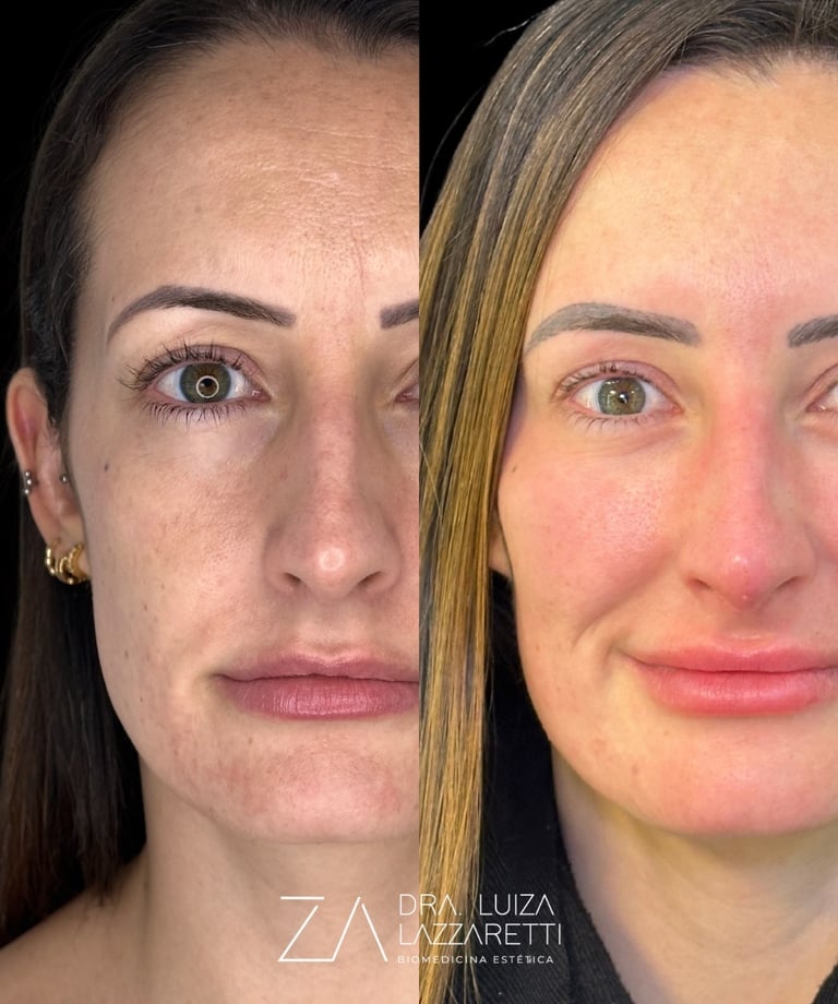 Equilíbrio facial com ajustes sutis no nariz, queixo e lábios, sem necessidade de cirurgia.